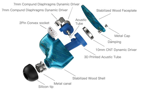 3DT utilized three dynamic drivers: Dual Compound Diaphragms Drivers for Bass (7mm+7mm) plus 10mm CNT Driver for Mids and Treble. We brought the authentic dynamic bass along with stunning transparency and clarity. With this driver combination, we provide the classic dynamic flavor with enhanced technical performance to the audience. The sound signature leans towards relaxing and refined with uplifting treble and ultra-highs.
